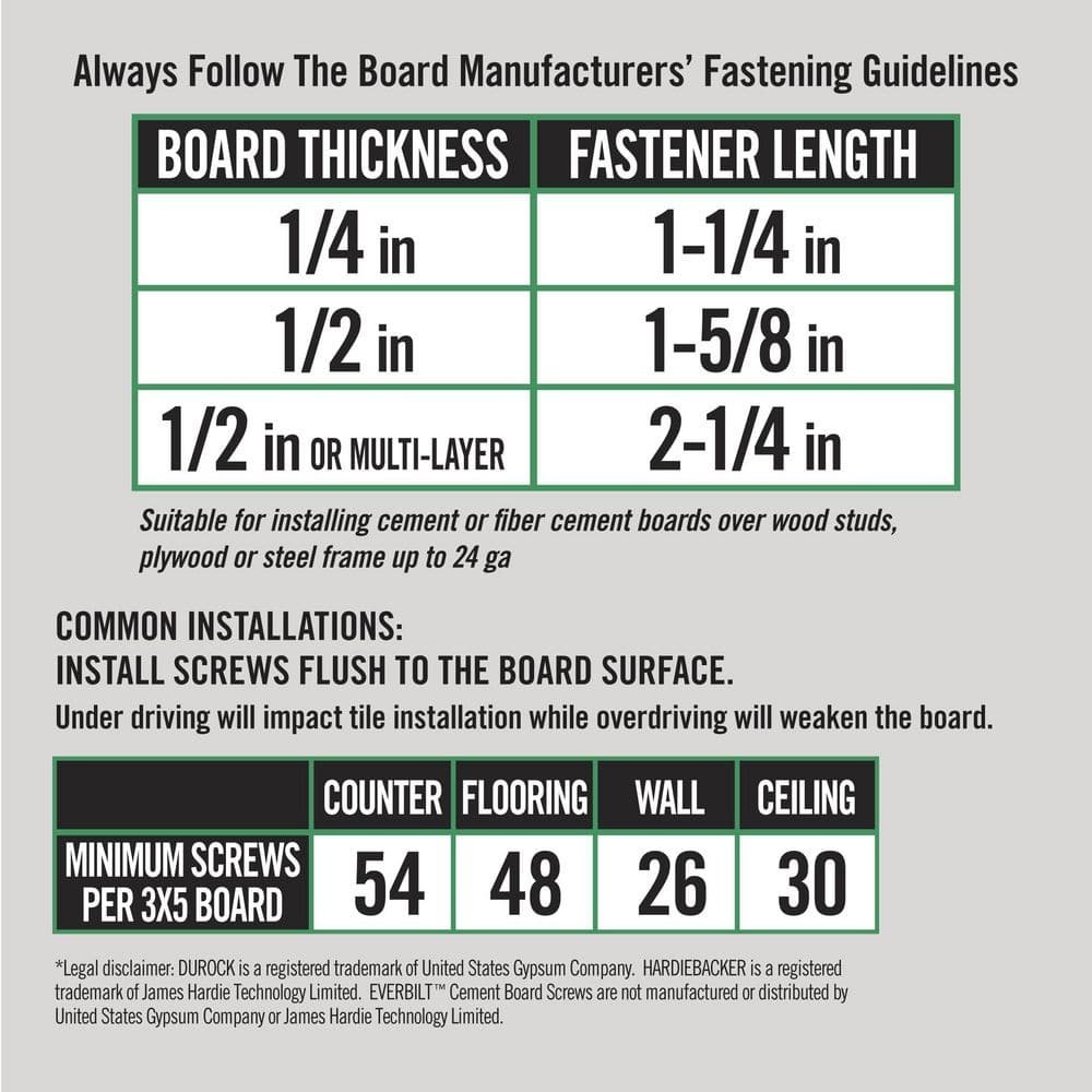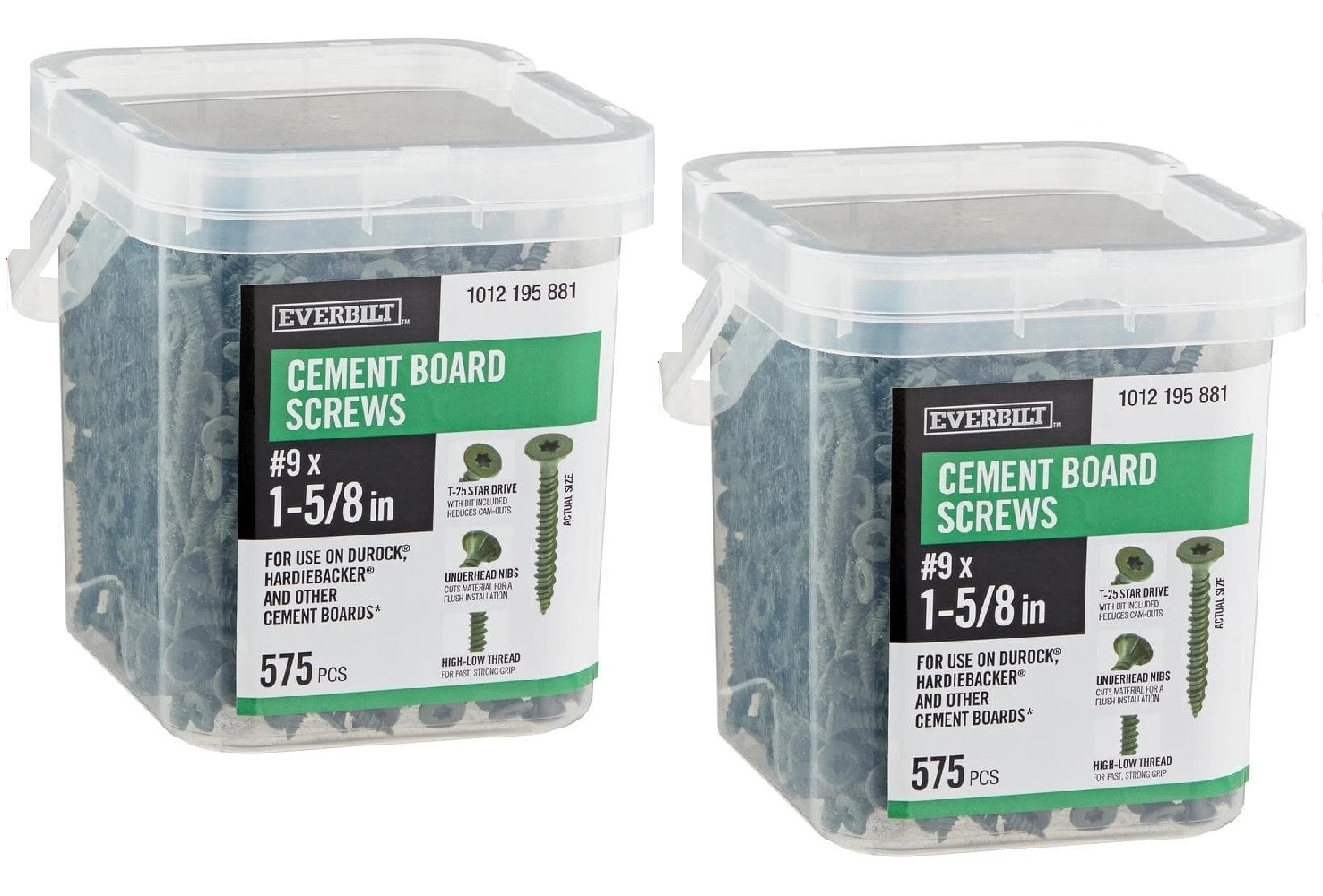 The Everbilt Cement Board Screws offer exceptional features to make any cement board installation a breeze. The cement board screw will start fast, leveraging the sharp point to engage with the high low threads gripping the dense material as you drive. Whatever you install over your cement board, this fastener will not get in the way. With underhead nibs, material is bored from the fastener head location to ensure the fastener seats flush to the surface of the board. The rings on the surface of the head offer additional surface area for exceptional adhesion of tape and thinset that may be applied.