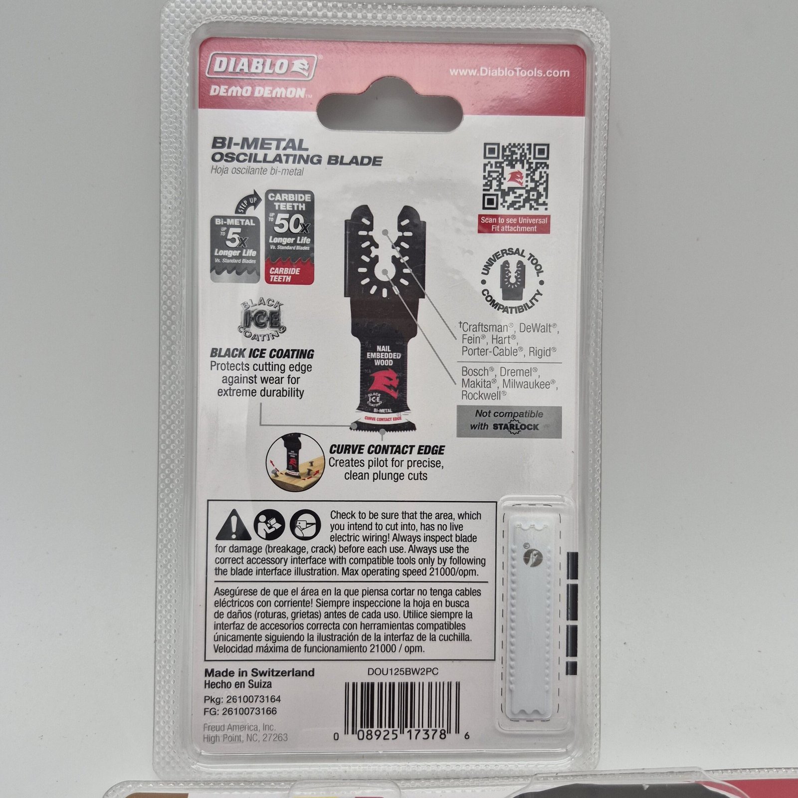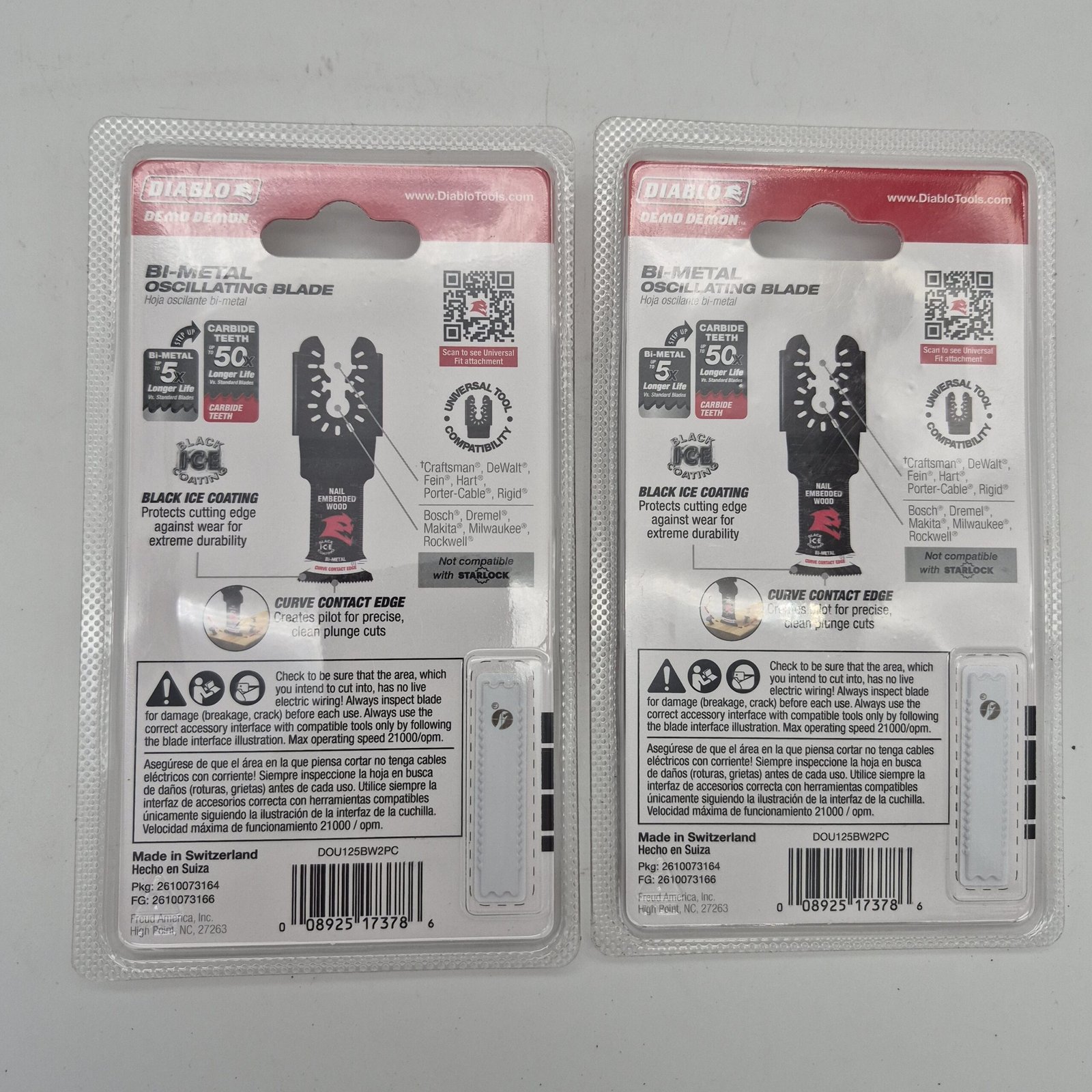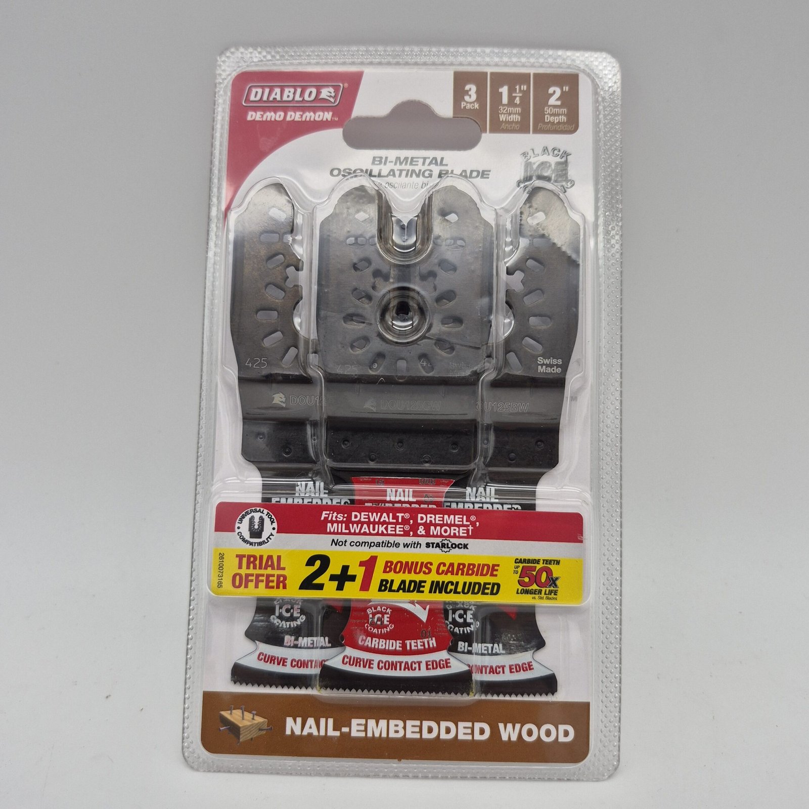 (2) New, sealed Diablo Demo Demon bi-metal oscillating blade set made for cutting nail-embedded wood. Features Black Ice Coating for added durability and a Curve Contact Edge designed to help create clean, precise plunge cuts.