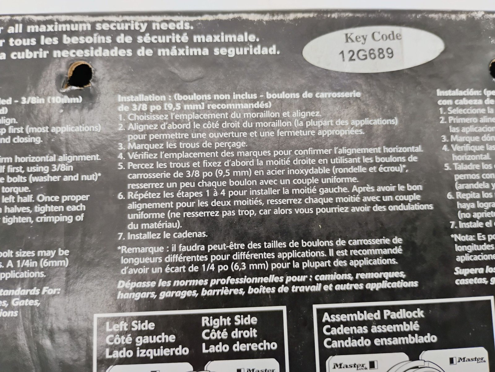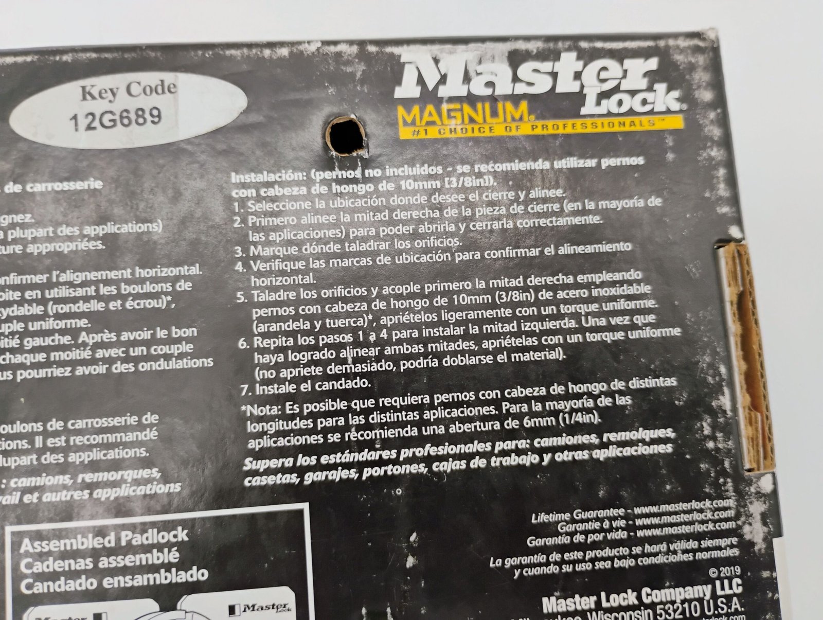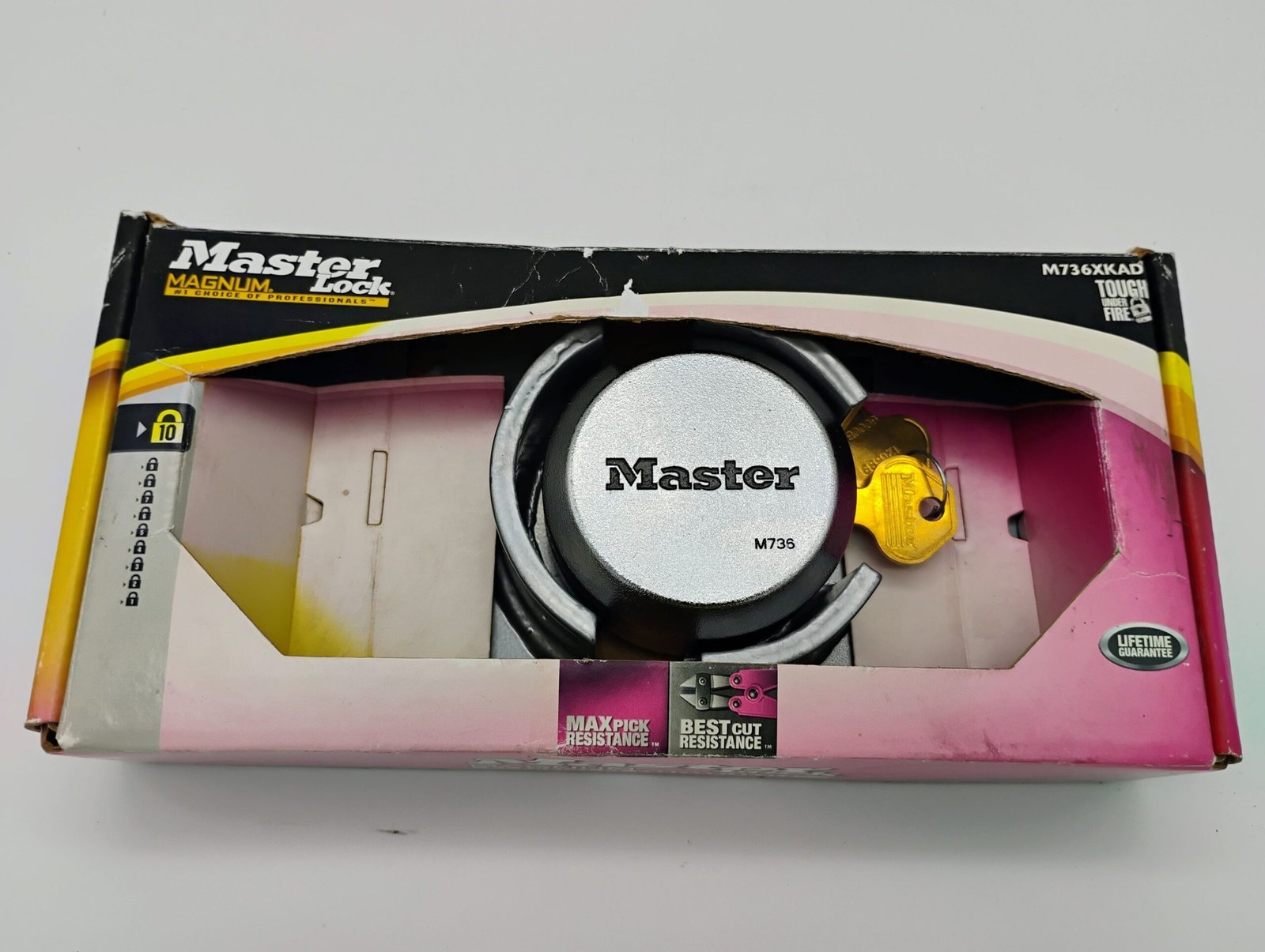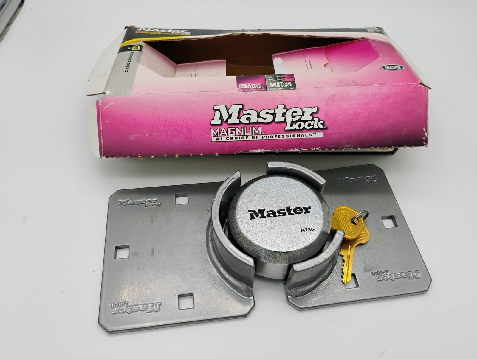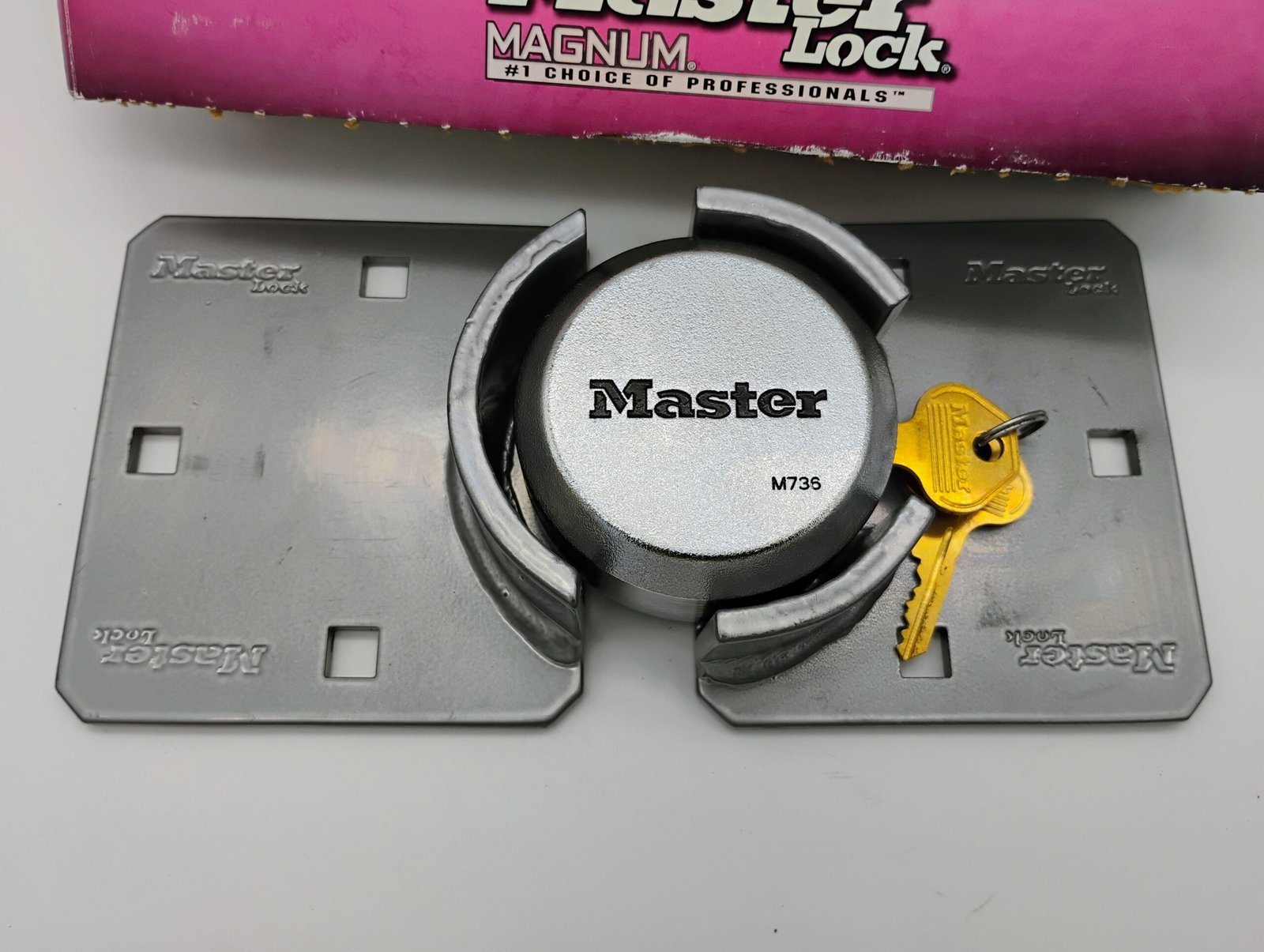 The Master Lock M736XKAD Heavy Duty Padlock with Key, Hidden Shackle features a 9-1/6 in. (23 cm.) wide, high security hasp made of zinc plated solid steel. Hidden shackle padlock is 2-7/8 in. (73 mm.) wide and offers maximum strength, reliability and corrosion resistance. Padlock’s hidden shackle design eliminates shackle exposure and protects against bolt cutter attacks. Key lock five-pin cylinder prevents picking. Master Lock’s Lifetime Guarantee provides peace of mind from a brand you can trust.