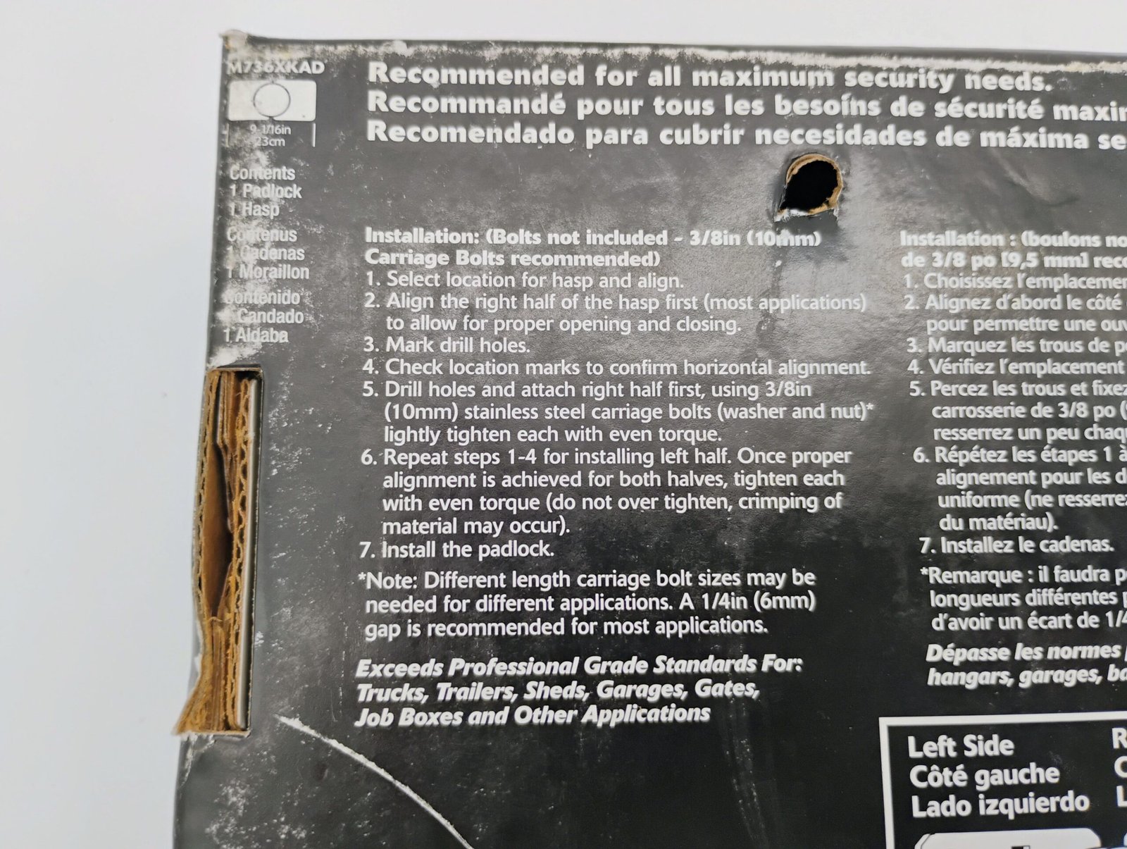- Measurements: Hasp is 9-1/16 in. (23 cm.) long; Lock body diameter is 2-7/8 in. (73 mm.); 3/8 in. carriage bolts recommended for installation (Bolts are not included)