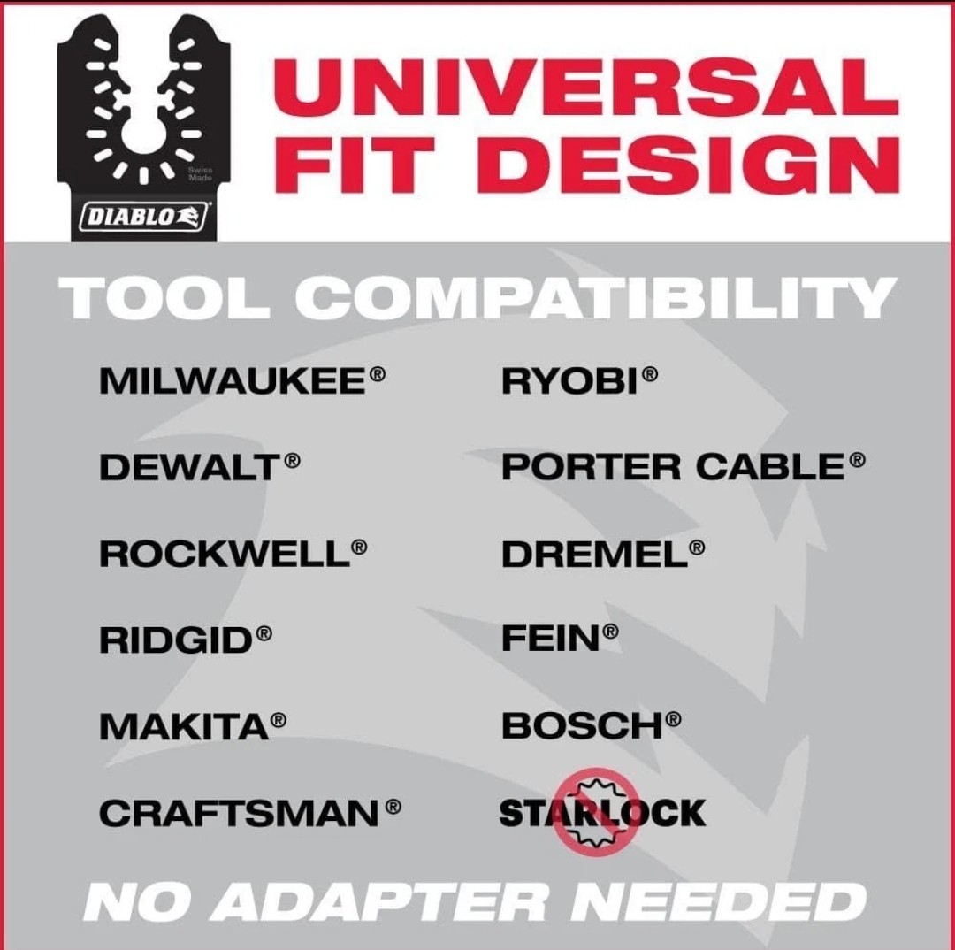 DIABLO universal fit bi-metal oscillating blades feature application specific designs that deliver extreme durability and superior cutting life in multiple applications ranging from nail-embedded wood, clean wood, metal and plastics. These high-performance blades feature an ultra-hardened cutting edge to deliver up to 5X longer life than standard blades. Curve contact edge creates a pilot for precise, clean plunge cuts with less vibration. An optimized blade design and Black I.C.E. (Industrial Cooling Element) coating protects cutting edge against wear for extreme durability and longer blade life. The blade’s universal fit, adapter-free design easily attaches to most tools, with the exception of Starlock tools.