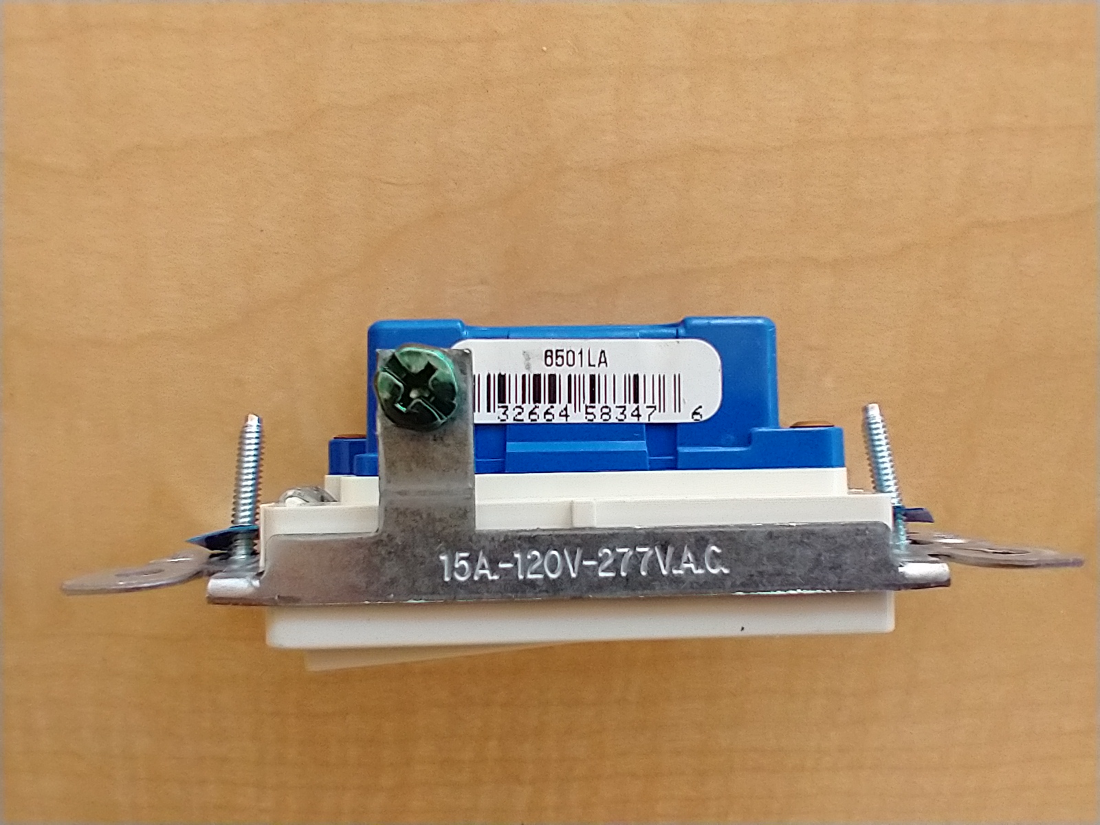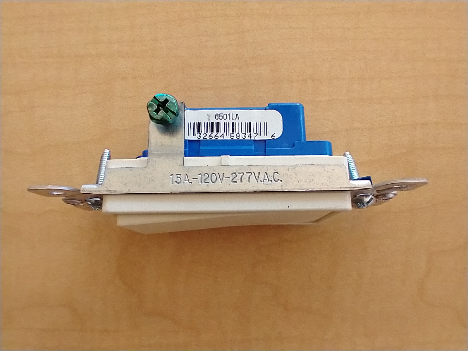 Cooper 6501LA light almond Decorator rocker switch. Specification Grade, single pole, push-in and side wired, grounding, rated 15A 120/277VAC. Features include: